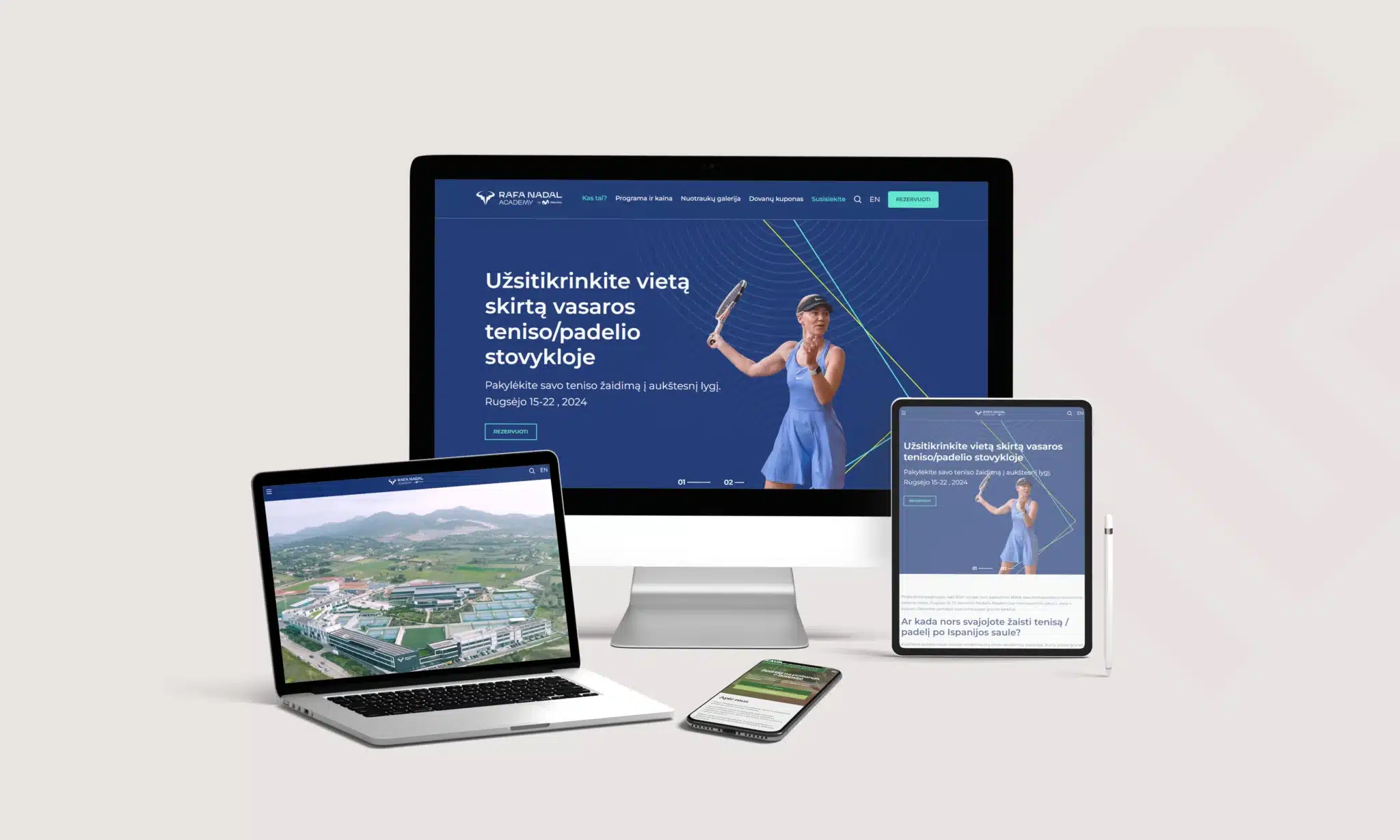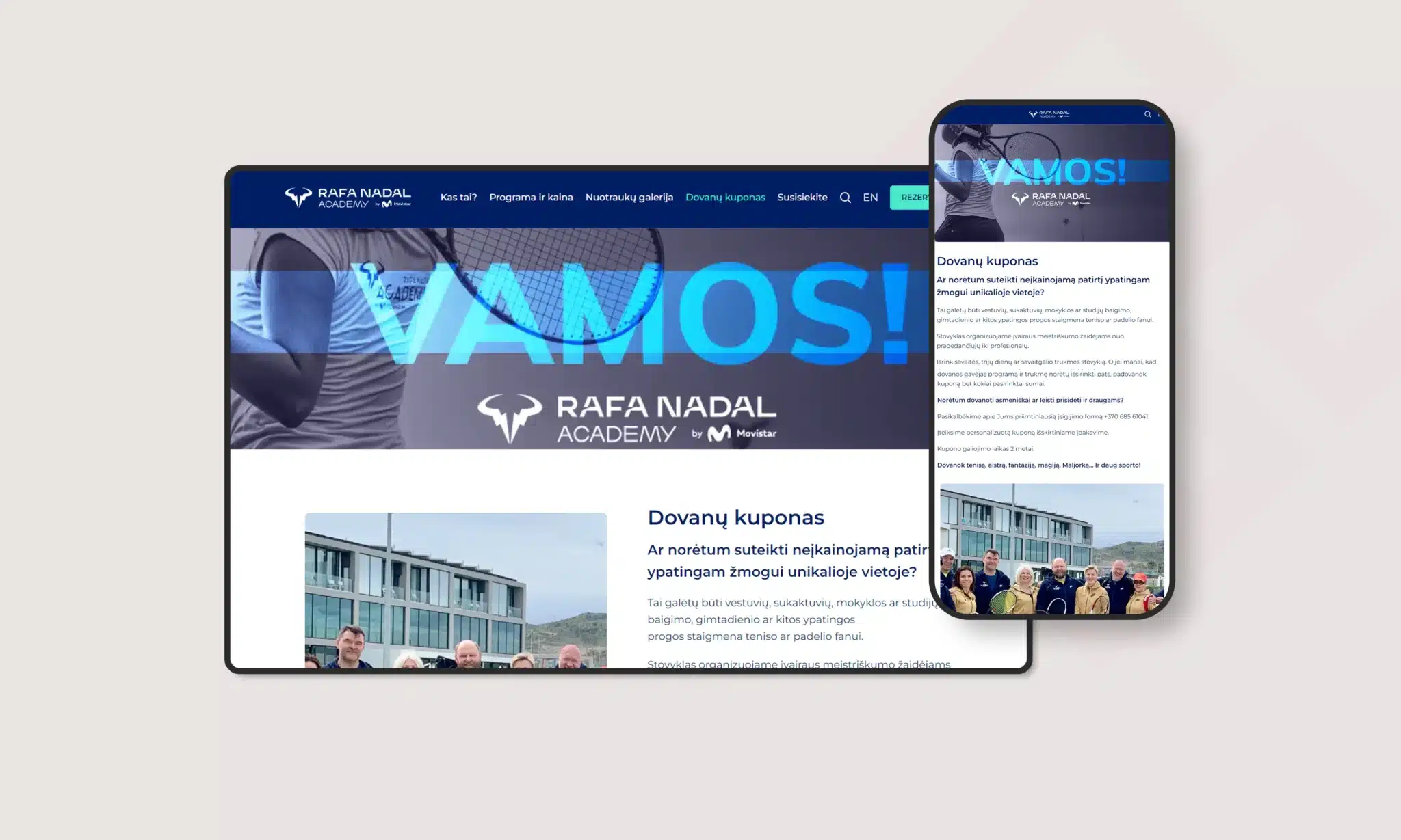 Sukurta unikali vieno puslapio svetainė, skirta RAFA NADAL ACADEMY by Movistar viešinti. Svetainės dizainas atspindi komplekso modernumą ir universalumą, patraukiant įvairias lankytojų grupes. Siekiant optimizuoti naudotojo patirtį, buvo iškeltas tikslas atnaujinti ir optimizuoti svetainę, kad svetainė būtų patogu rezervuoti vietą RAFA NADAL ACADEMY teniso/padelio stovykloje.